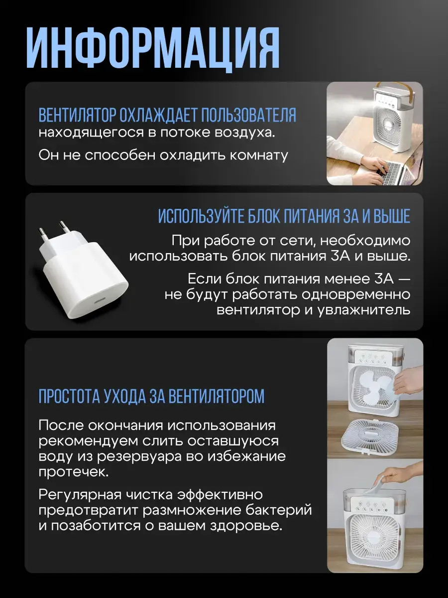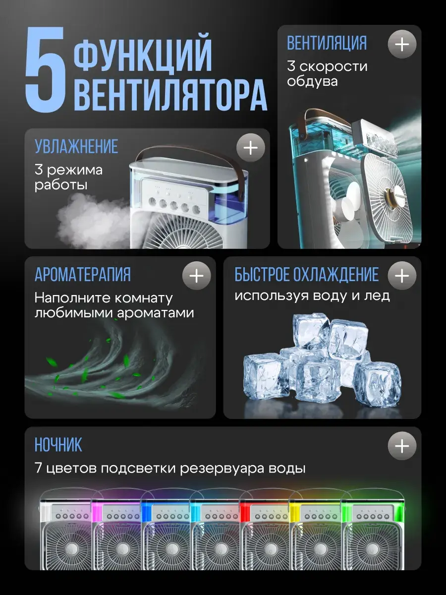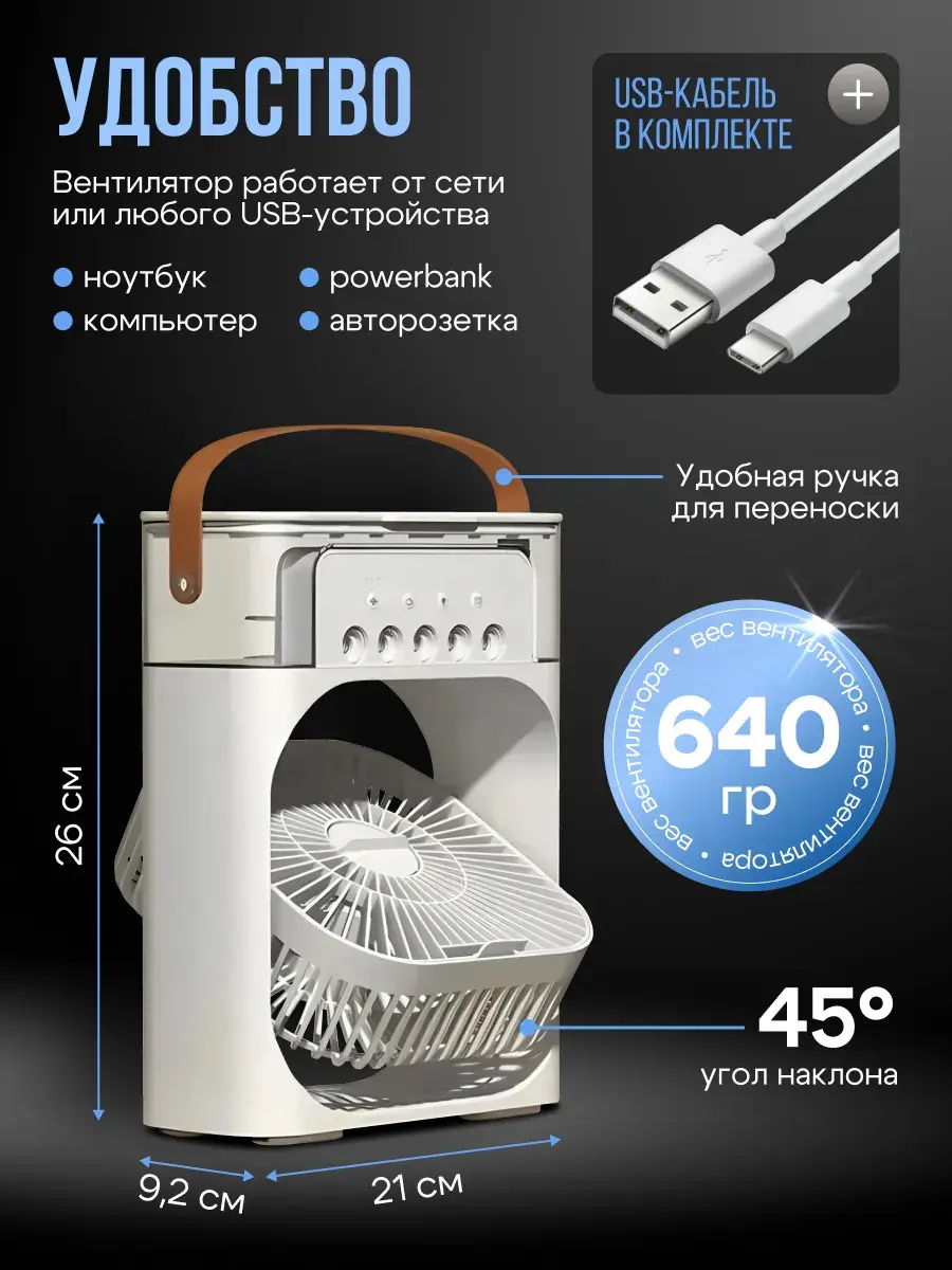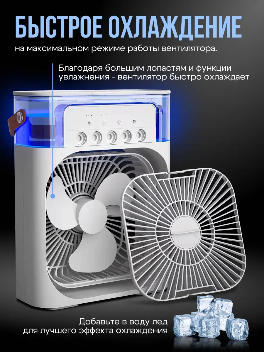 Освежите свое пространство с нашим вентилятором-увлажнителем с подсветкой. Этот мини кондиционер настольный компактный и эффективный вентилятор не только обеспечивает освежающий поток воздуха, но и увлажняет его, создавая комфортные условия даже в самые жаркие дни. Наш вентилятор-увлажнитель - идеальный выбор для создания прохлады и увлажнения воздуха в вашем помещении. Его удобный формат делает его идеальным для использования как на рабочем столе, так и на прикроватной тумбочке. Мини кондиционер настольный с подсветкой - это не только функциональное устройство, но и стильный аксессуар для вашего интерьера. Его подсветка добавляет атмосферу уюта и спокойствия в ваше пространство, делая его неотъемлемым элементом вашего дома или офиса. Обеспечьте себе прохладу и комфорт в жаркие дни с нашим вентилятором. Позвольте себе наслаждаться свежим и чистым воздухом в любое время года.